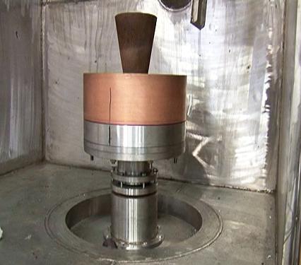 1307#產(chǎn)品ZGX-50B雙性能鑄造爐中的液壓隨動傾轉(zhuǎn)澆注系統(tǒng)與離心轉(zhuǎn)動機構系統(tǒng)是整臺設備的核心部件,它可以將熔煉好的鋼液用模仿人的操控動作快速準確倒入模殼中,然后開動轉(zhuǎn)動機構,使水冷結(jié)晶器帶動模殼按程序正反方向旋轉(zhuǎn),待高溫合金凝固后即得到細晶組織。這兩項動作必須連貫無誤的操作執(zhí)行才能成功。
